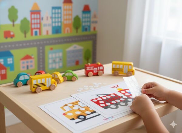 Child identifies the vehicle → Matches the dots → Peels & sticks stickers → Says the vehicle name aloud 🚦